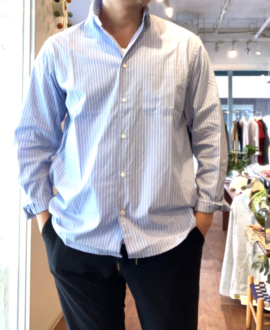 さて、今日はこの時期着やすいバンドカラーシャツのご紹介です。少し幅広で晩夏から秋にかけてに最適なリラックスシャツ。