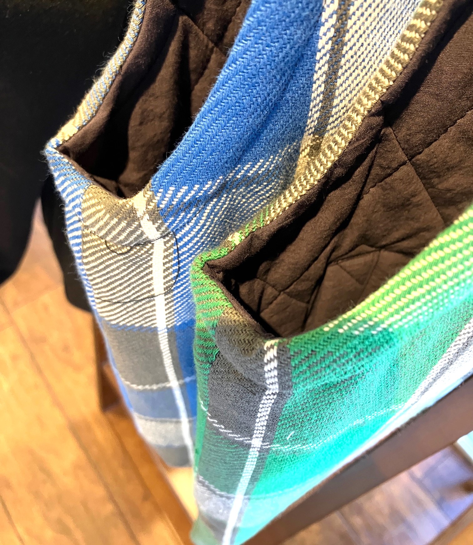 中綿入りのこちらのアイテム。 表側のチェック生地は綿100%で太番手の先染めチェック生地を採用しており、内側はポリエステルの中綿に綿麻ダンプ生地をキルトした素材を採用しています。