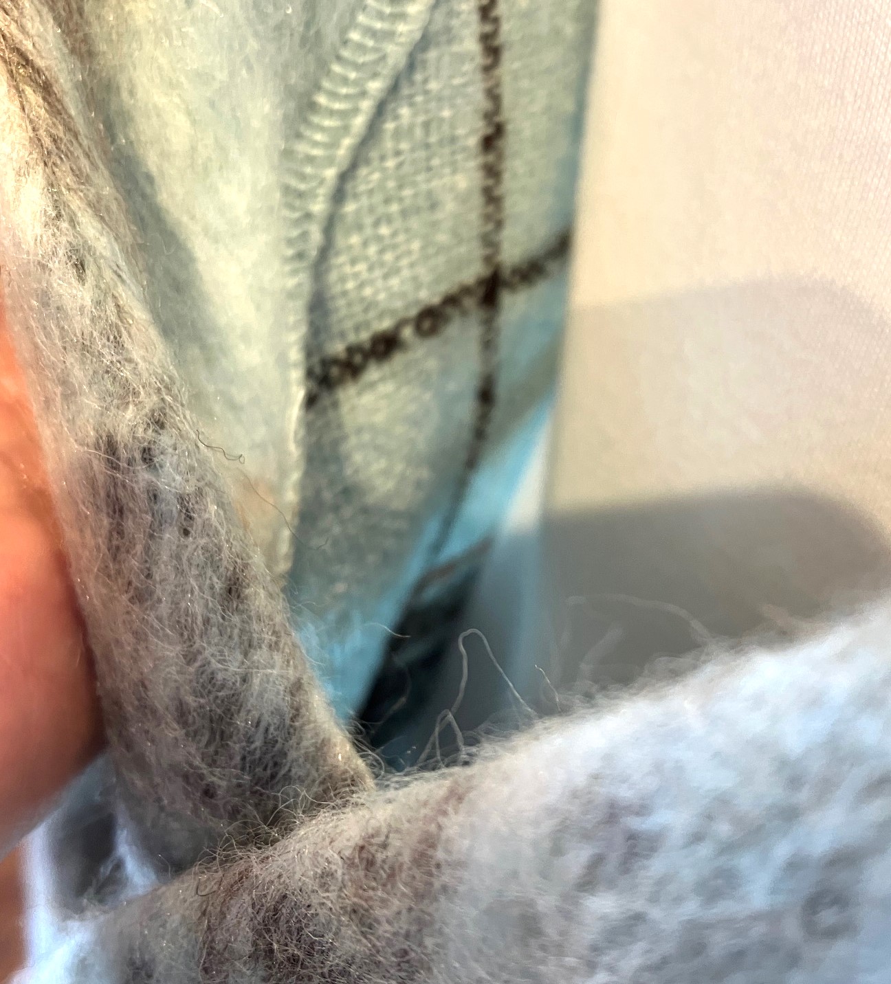さて、ファーのような肌触りで軽くて温かく、チェックが映えるカーディガンのようなノーカラーの羽織りが届いてます。