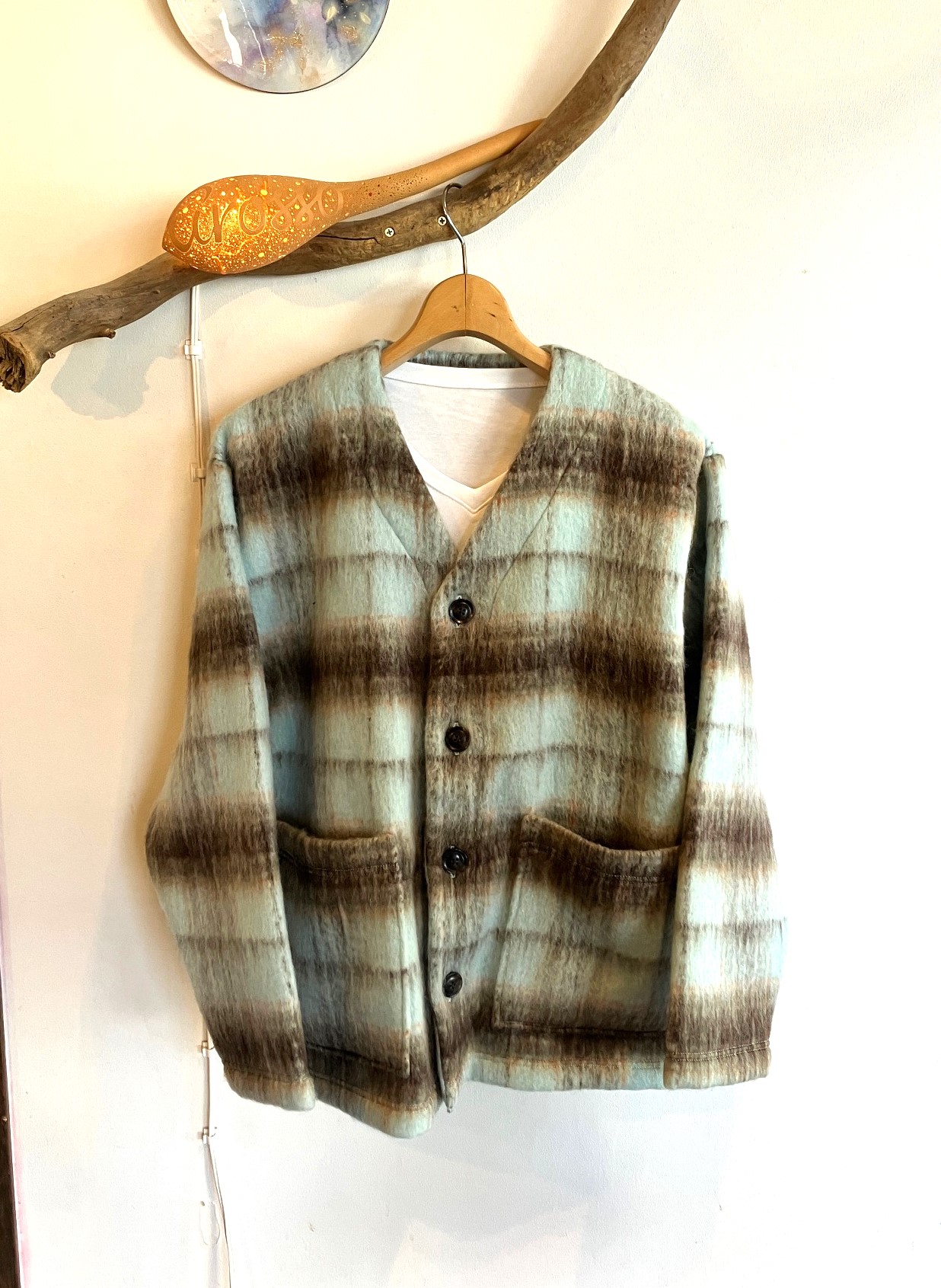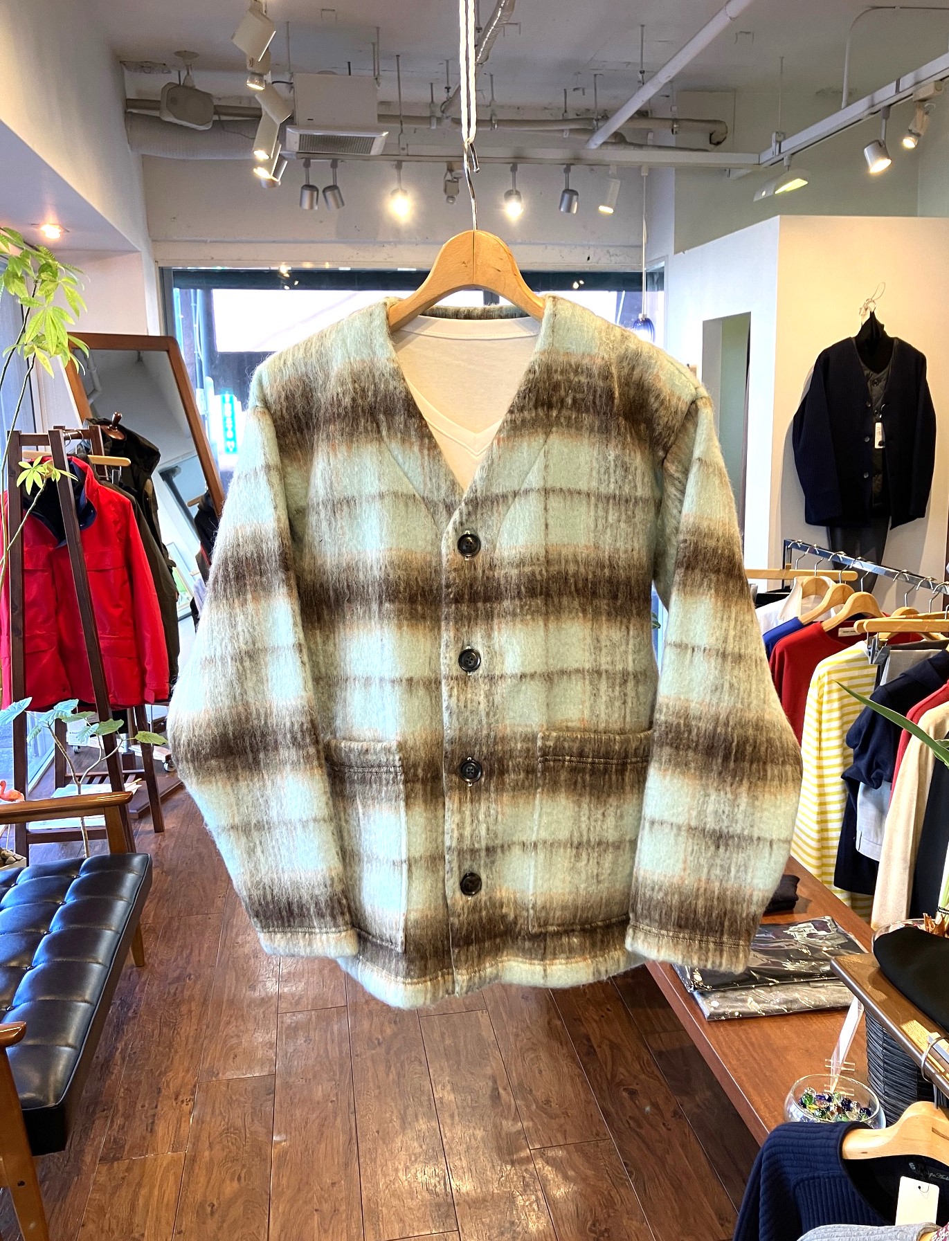 適度なコシと膨らみのある風合いが特徴的な素材。カーディガンに比べてノーカラーのライナーJKTとして、JKT感が更に強くなってます。ライニングの雰囲気は残しつつノーカラーでリブ使いが洗練されていてまたボタン留めではなくスナップ留めのところもアウターとして活躍してくれそうなのが嬉しい。もちろん寒い時期はライナーの役割もしっかり果たしてくれます。