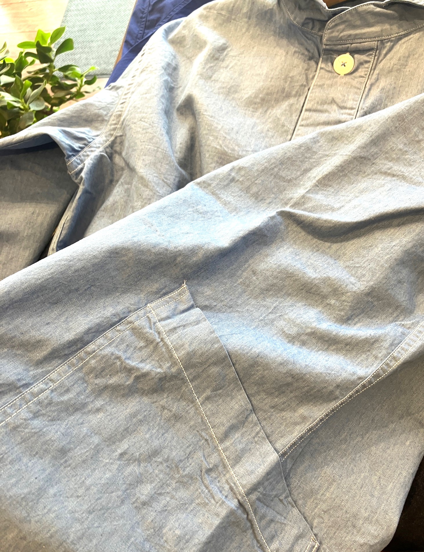 コットン100%で定番マルエリプルオーバーシャツのデニムバージョンのこちら。 4.5オンスのMADE IN JAPANデニムで、経年変化も楽しめそうな1着。