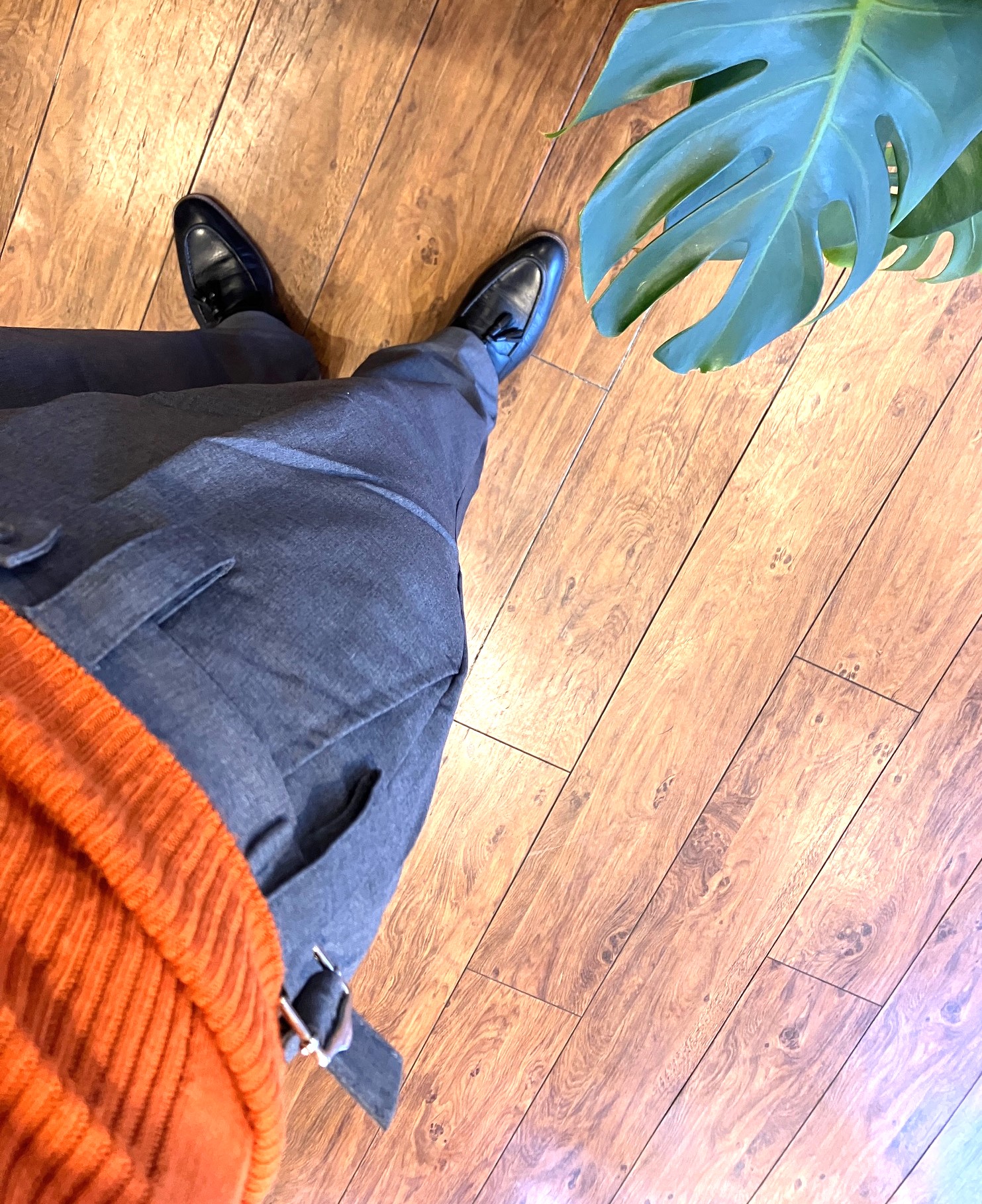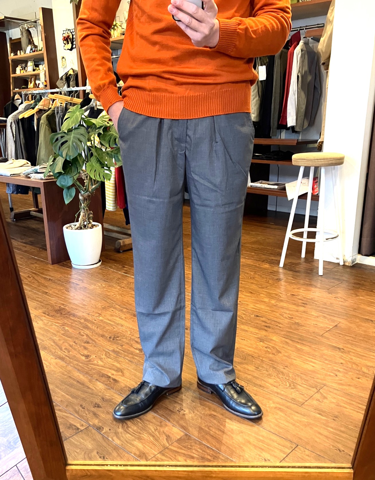 さて、今日は当店ではめずらしくワイドなパンツのご紹介です。若者寄りになりすぎない大人のストレートパンツです。