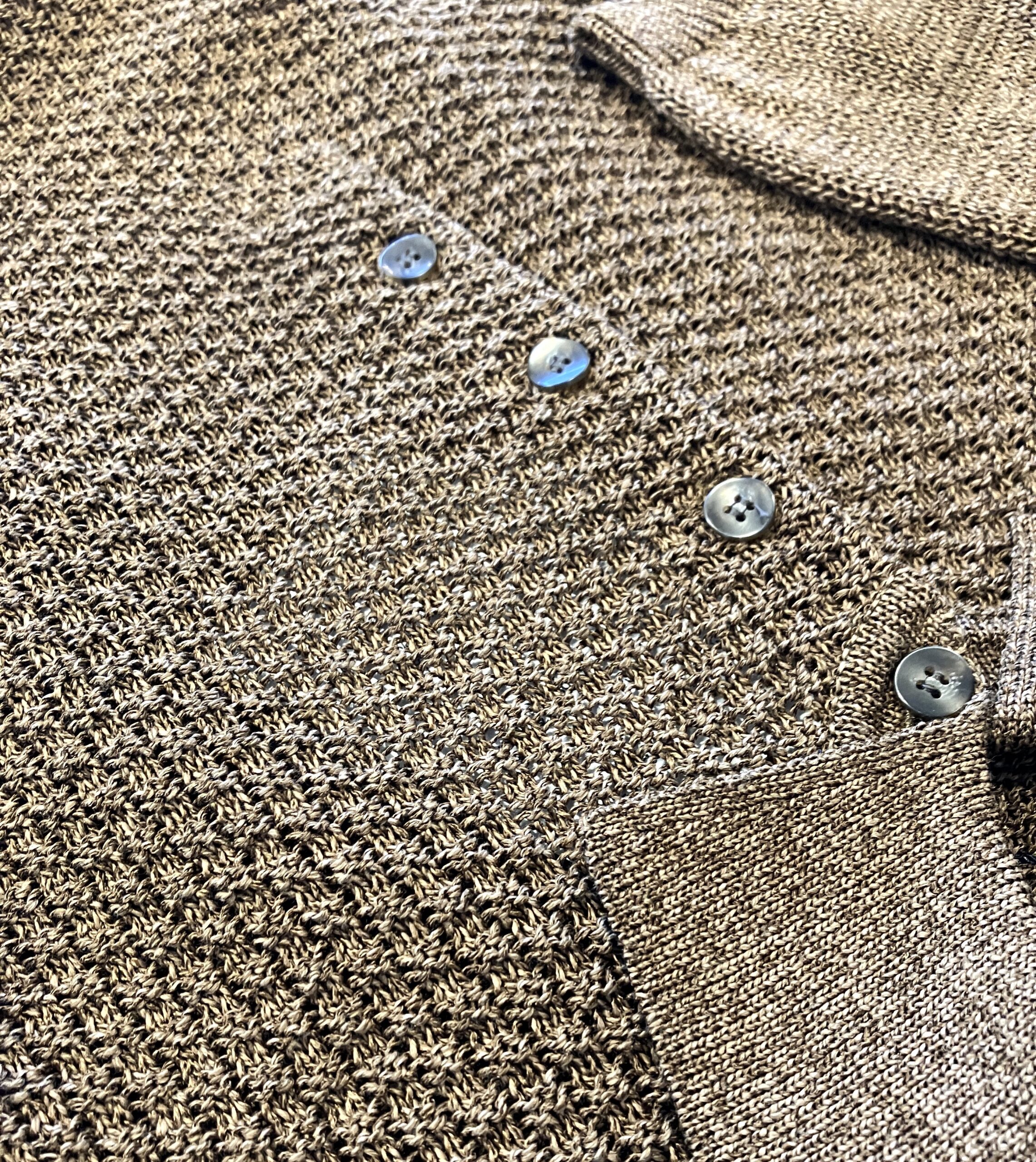 コットン×レーヨン×和紙の混紡素材。 5Gの少し大きめの編みと、4つボタンが高級感を醸し出しています。ボタンも反り返った変型ボタンでさりげなくお洒落です。